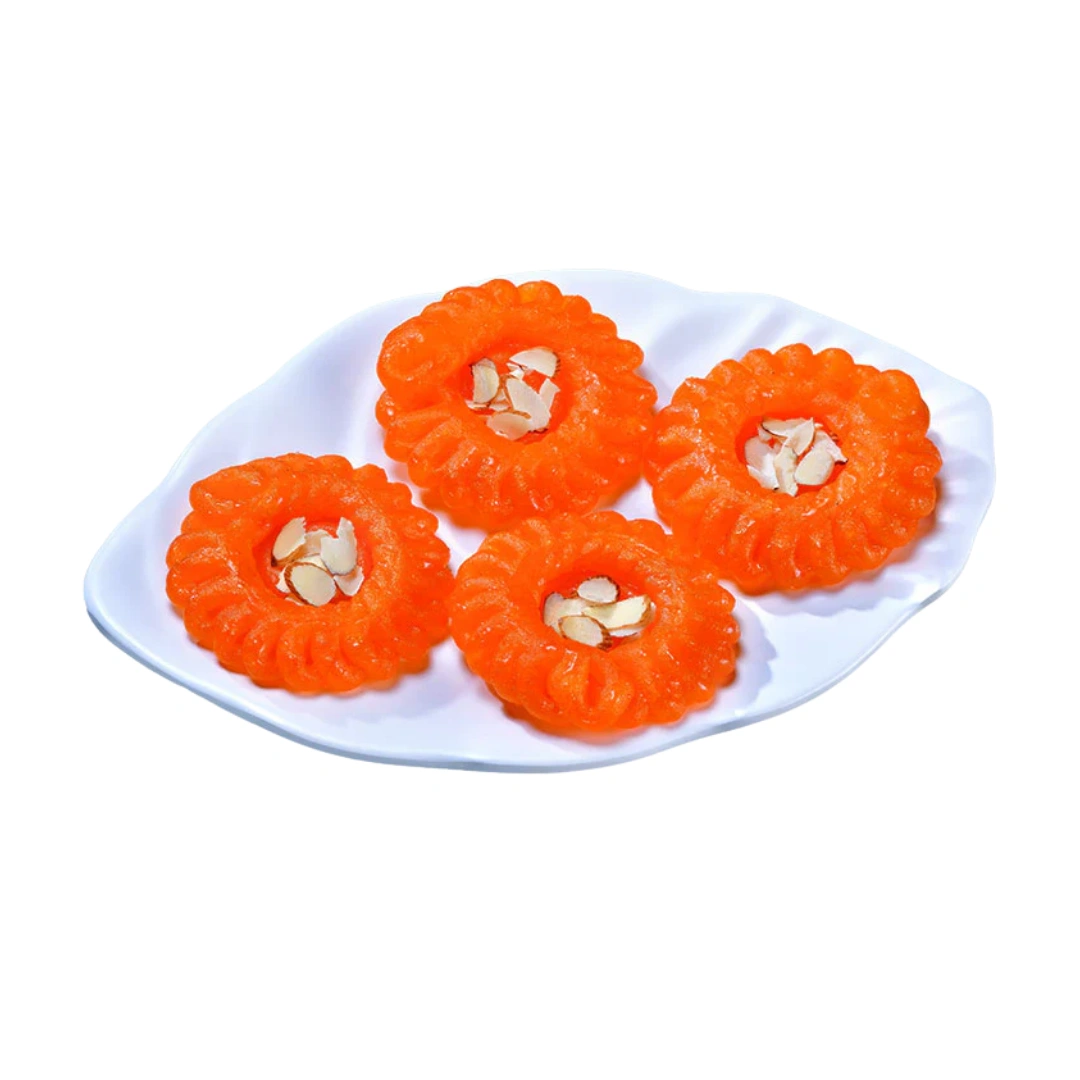 Bright, juicy, and irresistibly sweet, these mini swirls of jangiri are made with urad dal batter, deep-fried to perfection, and soaked in aromatic sugar syrup — a festive favorite in every bite.